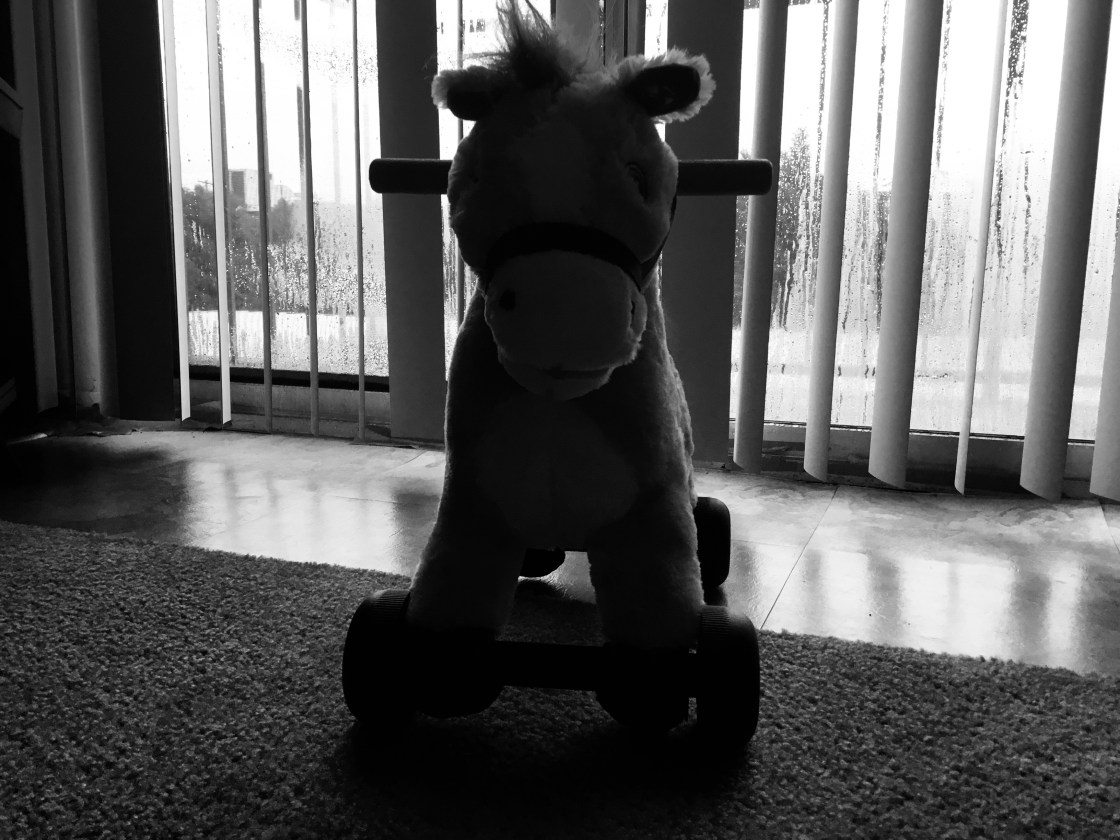 [The following is a transcript of the conversation between me and Andrew’s horse, Tinahorse. The horse, a ride-on toy, was a gift from his great grandparents. The name comes from Tina Belcher on Bob’s Burgers, which is a show Andrew has seen clips of. The conversation took place in the living room this past Thursday night, and concerns me trying to scrub a long set-in coffee stain off of a rug.]